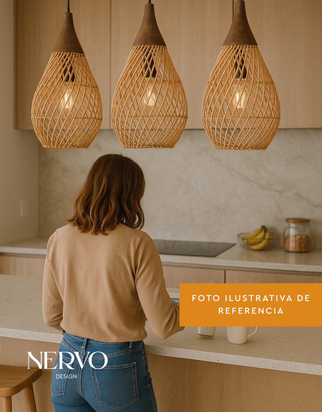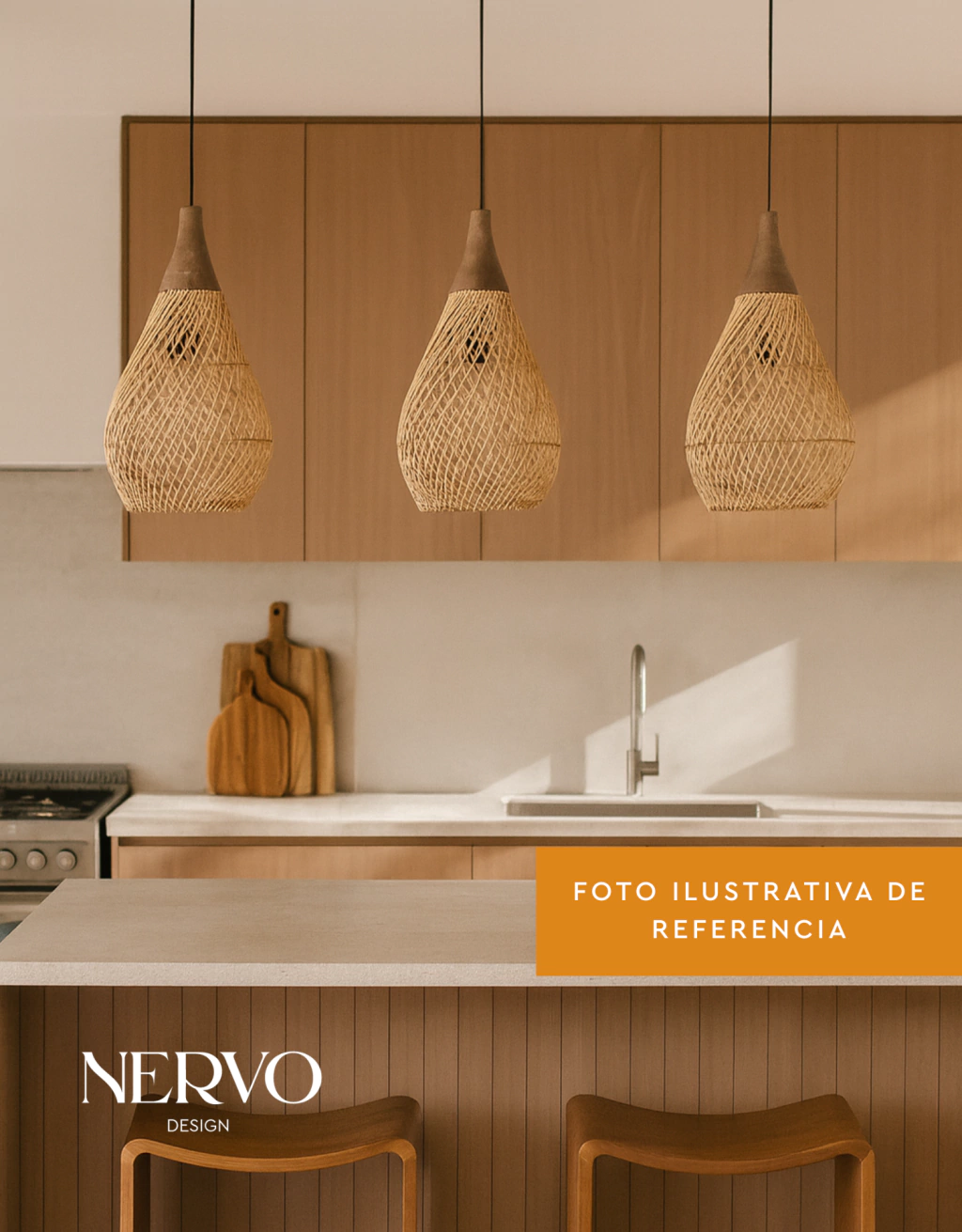 Este set de 3 lámparas es perfecto para colocar sobre barras o islas de cocina, logrando un espacio cálido, armónico y con un toque natural que enamora. Su diseño de líneas orgánicas y materiales nobles las convierten en piezas protagonistas que realzan cualquier ambiente.