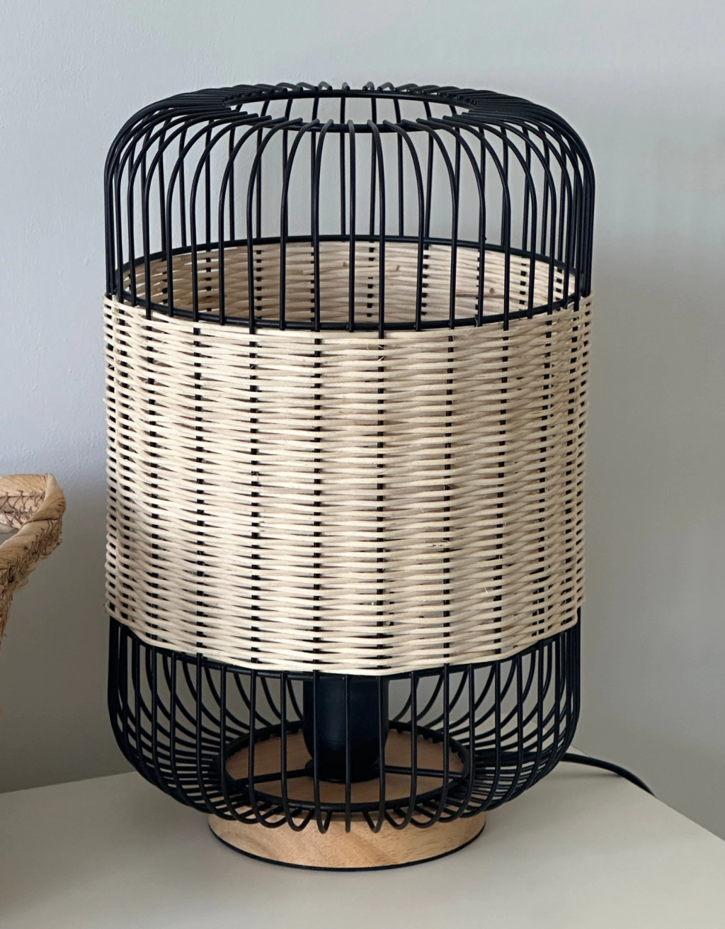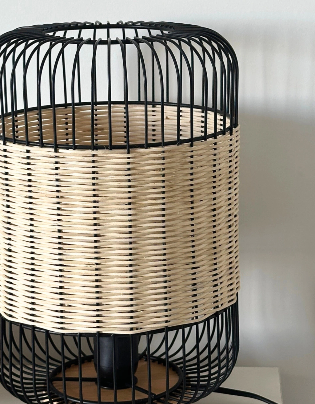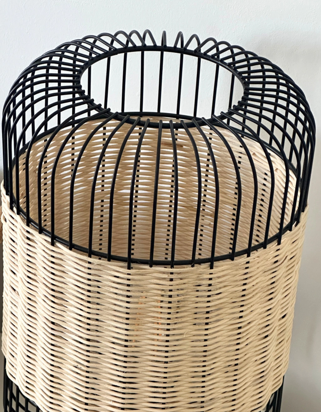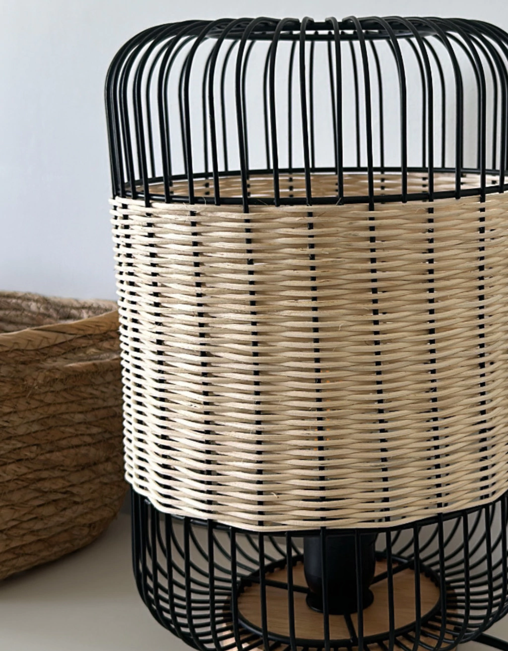 Este velador combina la calidez de las fibras naturales con la solidez del metal negro, creando una pieza versátil y sofisticada. Su estructura de hierro negro brinda resistencia y un diseño contemporáneo, mientras que el tejido artesanal de ratán en tonos claros aporta calidez y textura.